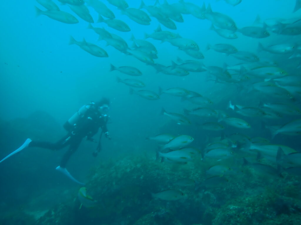 前日まで23℃あったという水温がこの日は19℃、20℃ 熊野と串本と変わらない水温。まだ5ミリのウェットスーツでは少し肌寒さを感じました・・・・