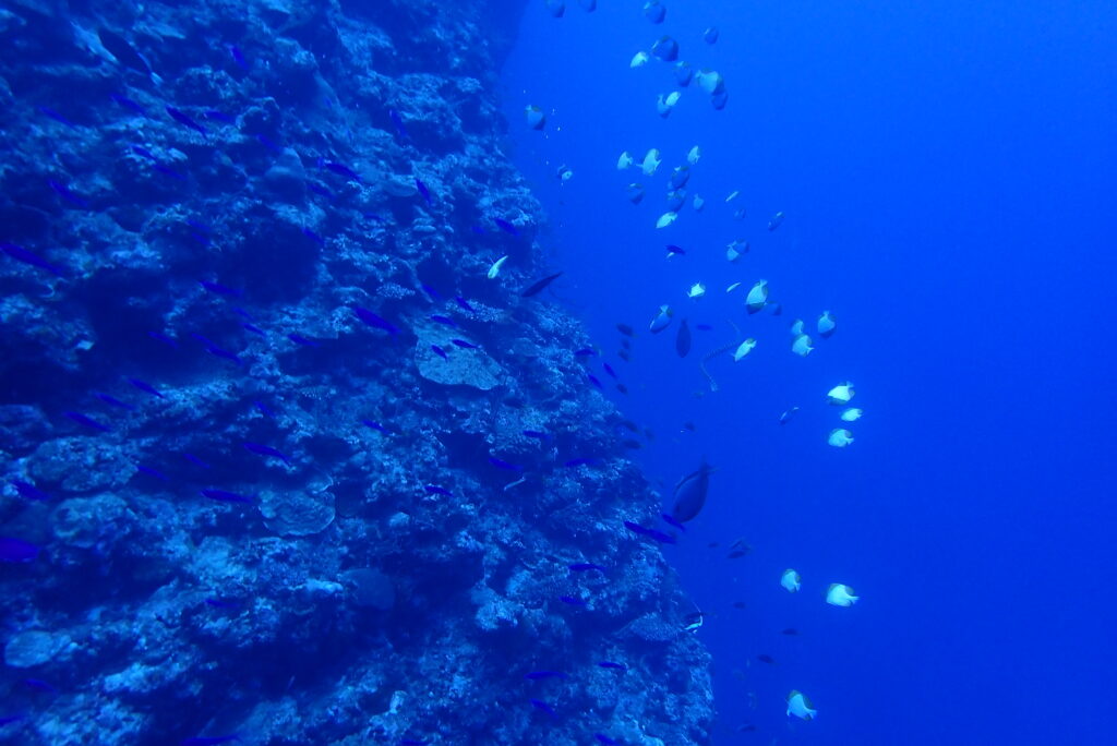 壮大なドロップオフで「カスミチョウチョウウオの群れ」を見ると